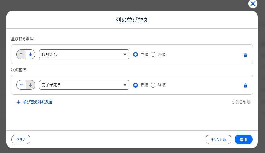 例えば、取引先名で第一ソート、完了予定日で第二ソートといった、より詳細な並び替えが可能になります。