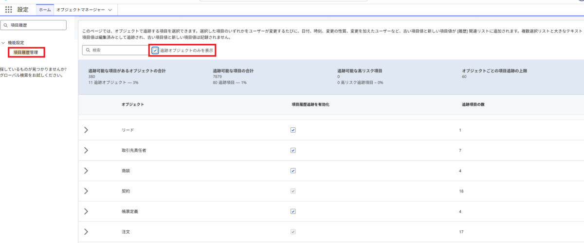 項目履歴管理を有効にしているオブジェクトが一覧で確認できるようになりました。