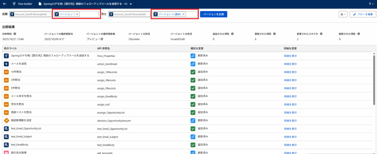 フローのバージョン間の差分を、フローの画面上で直接確認ができるようになりました。