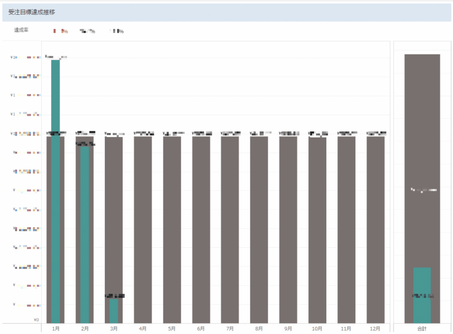 実際に使用しているグラフの画像を使用している関係でモザイクをかけているので分かりづらいかと思いますが、各棒グラフの上に受注金額と目標金額の実際の数値を表示しています。