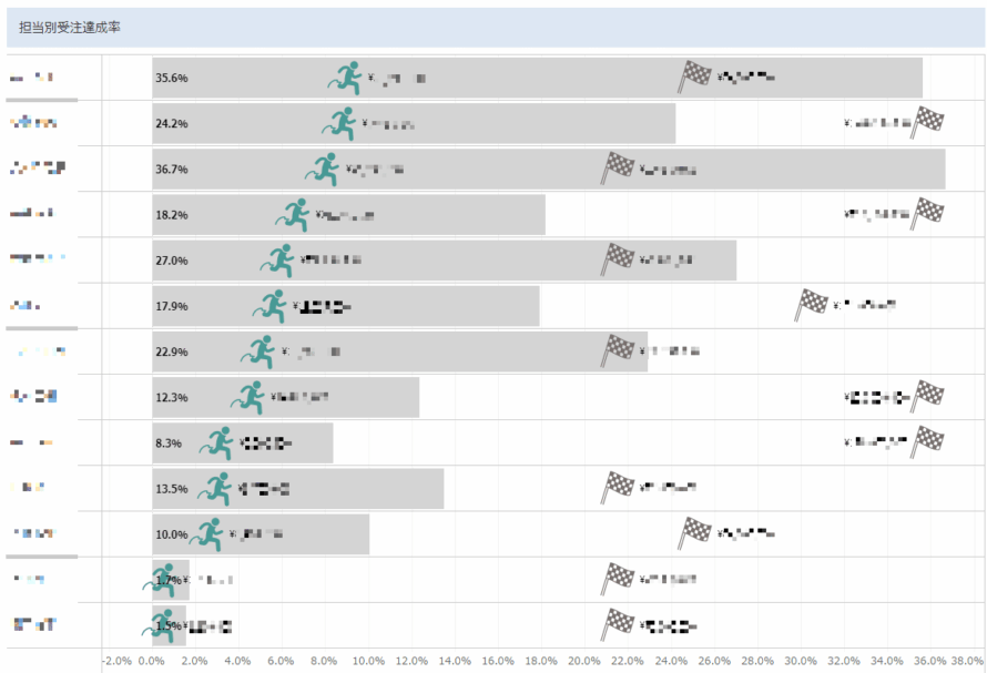 - 進捗率・目標金額・受注金額を棒グラフと形状を用いてひとつのグラフで表現した