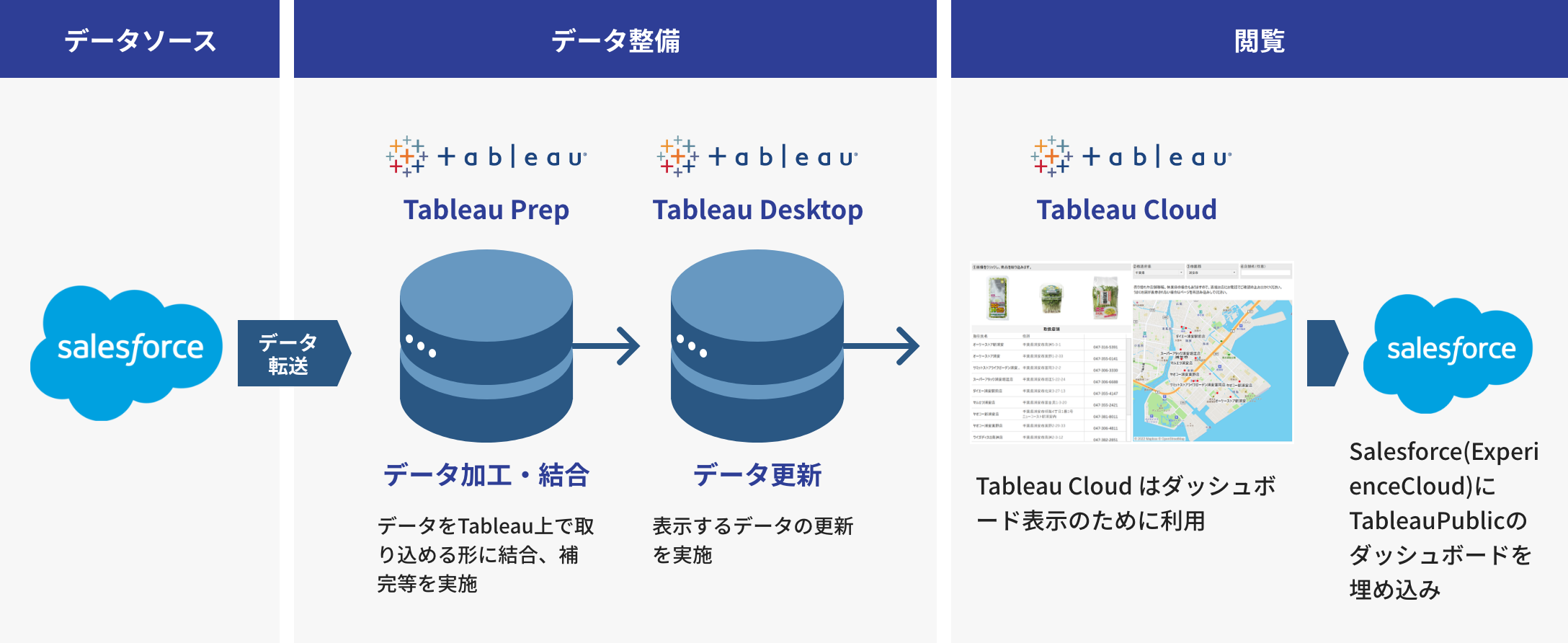 この目的を実現するために採用されたのが、SalesforceとTableau Publicを組み合わせた商品検索ダッシュボードです。